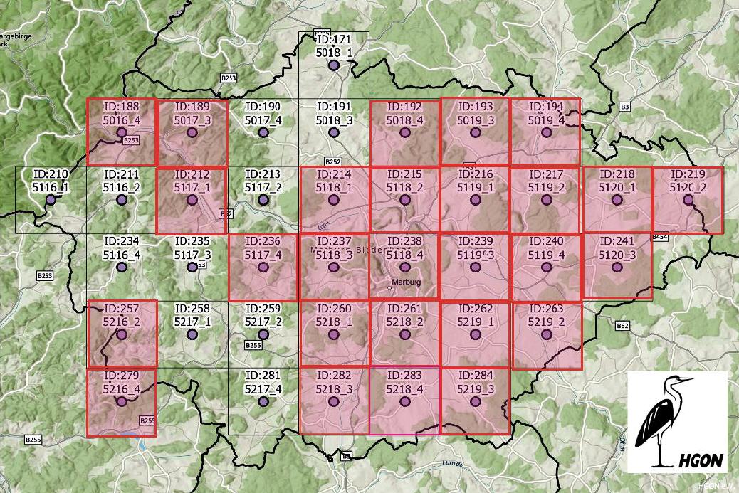 Im Landkreis Marburg-Biedenkopf hat die Kartierung für ADEBAR2 in diesem Frühjahr begonnen. Koordiniert durch die Arbeitskreisleitung haben ornithologisch interessierte Mitglieder der HGON sich 'ihren' Quadranten eines Messtischblatts ausgesucht und erproben nun die Kartiermethode. Leider konnten noch nicht alle Messtischblätter vergeben werden, aber dafür stehen die kommenden Jahre bis 2028 noch zur Verfügung, so dass wir fast sicher sind, den gesamten Landkreis abdecken zu können (April 2024).